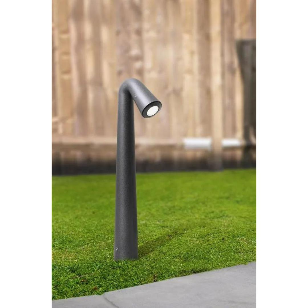 Bolardo LED con diseño moderno y emisión de luz dirigida, de material de resina resistente a los golpes, estabilizado a los rayos UV, óxido y libre de corrosión.