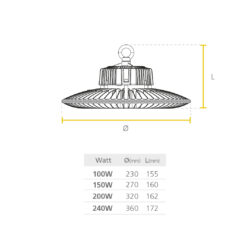 Luminaria LED High-Bay para instalación colgante con gancho por su bajo peso. Proyección uniforme de luz con ópticas especialmente diseñadas para aplicaciones de cubiertas altas. Reduce los costos de operación y mantenimiento gracias a su eficacia y vida útil. Potencia seleccionable.