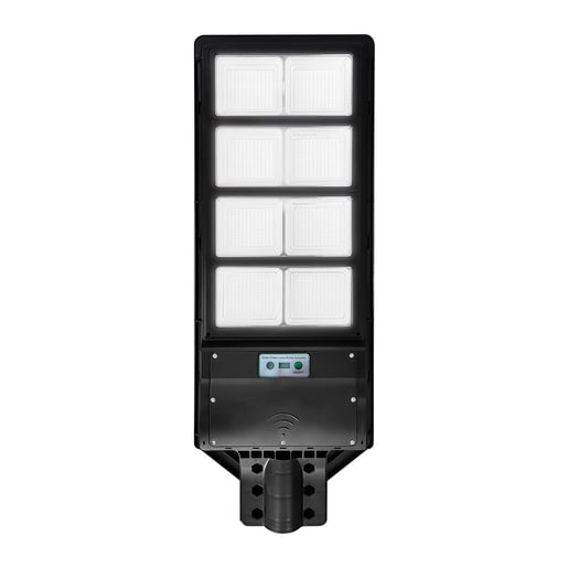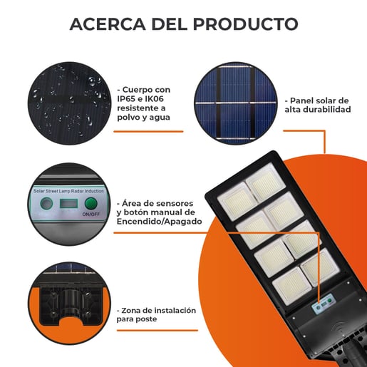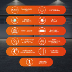 Luminaria solar para poste o pared, diseño todo en uno: panel solar, batería y led integrados, útil en apliacciones fuera de la red eléctrica, áreas remotas y otros.