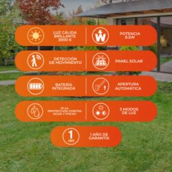 Incluye panel solar, sensor de movimiento y accesorios de instalación.
