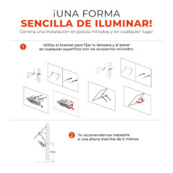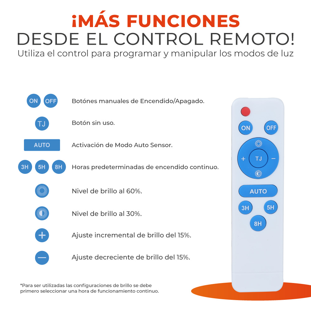 y control remoto (2 baterías AAA incluidas), útil en apliacciones fuera de la red eléctrica, áreas remotas y otros.