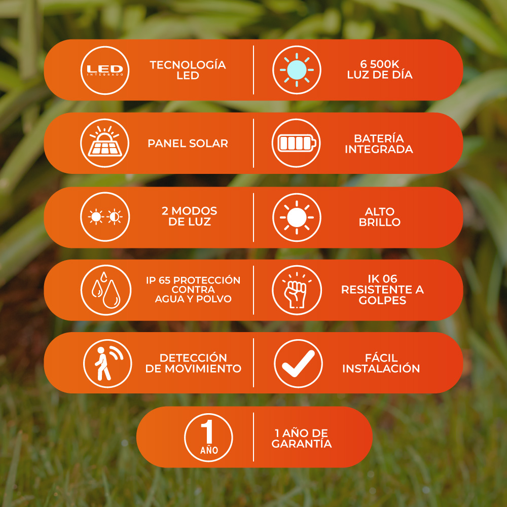 Incluye panel solar, sensor de movimiento y accesorios de instalación.