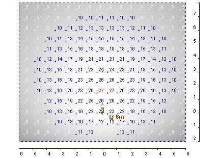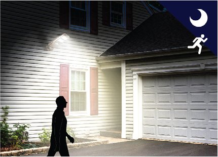 Si el sensor de movimiento detecta ocupación la luminaria enciende al 100% de su capacidad | Al no haber ocupación la luminaria se apaga | Ejemplo de aplicación Montaje a 6m de alto, inclinación de 45°. Cobertura aproximada 10m x 9m |